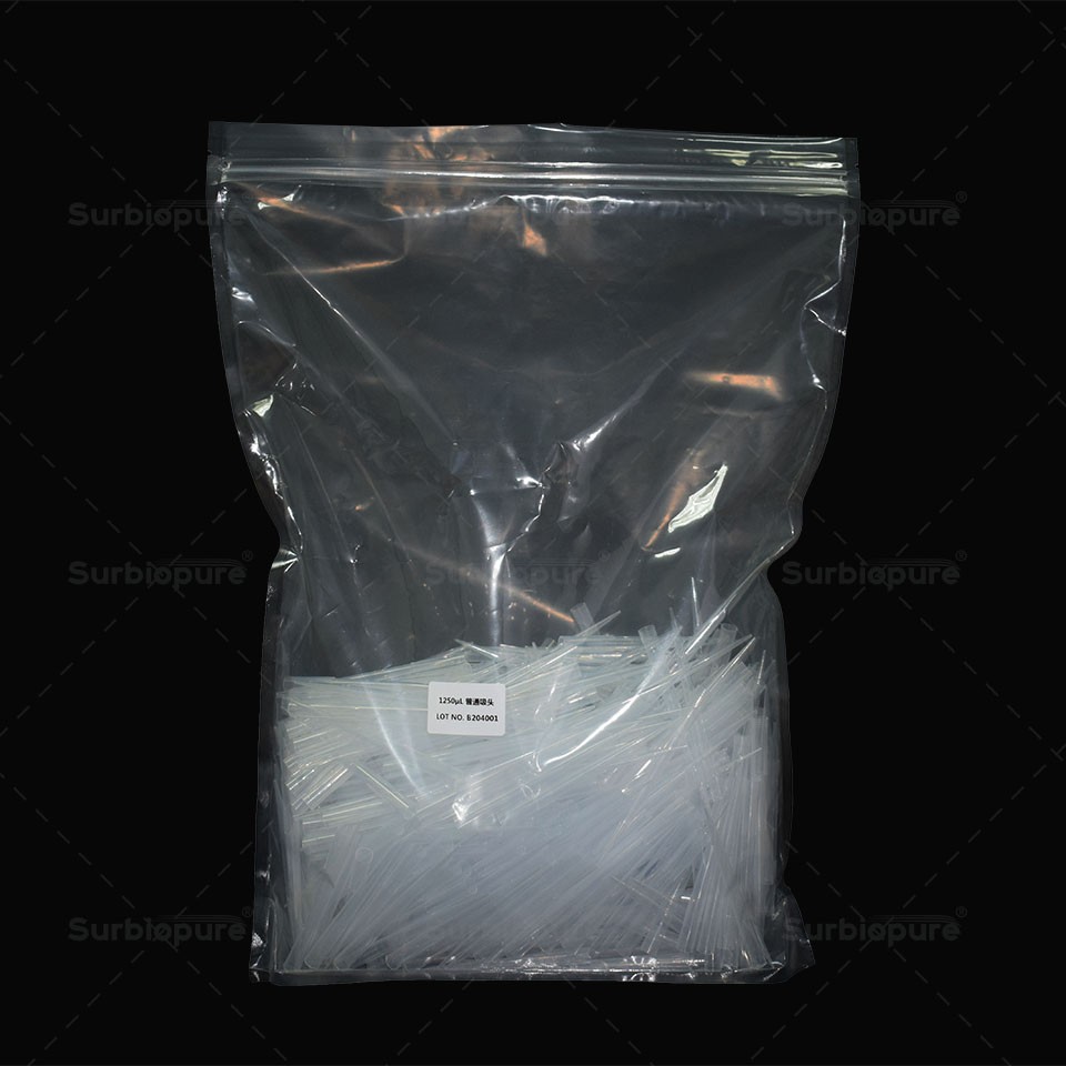 產品名稱:1250uL 透明普長吸頭,袋裝,無菌,無酶